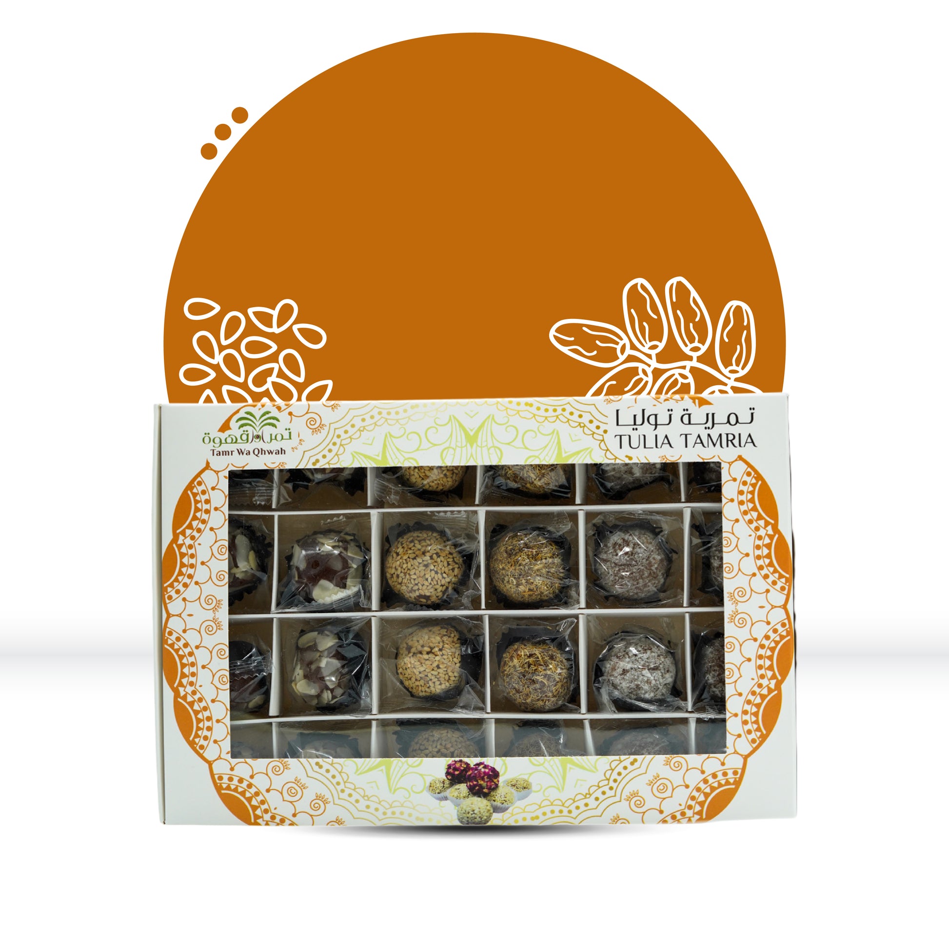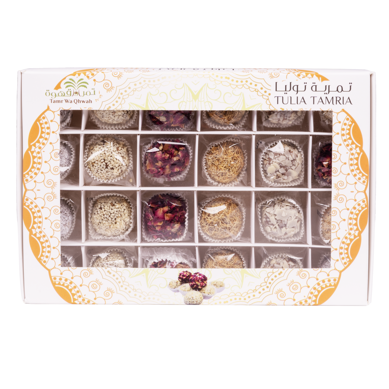 توليا تمريا منتج مصنوع يدويًا من معجون التمر، يمزج حلاوة التمر الطبيعية الغنية مع مزيج من المكسرات ونكهات عربية مميزة مثل ورد دمشق وجوز الهند والسمسم واللوز أو توابل الكنافة التقليدية. إنها متعة فريدة - كريمية وحلوة وعطرية - مثالية لمن يقدرون الحلويات الشرق أوسطية الكلاسيكية والحلويات الصحية.