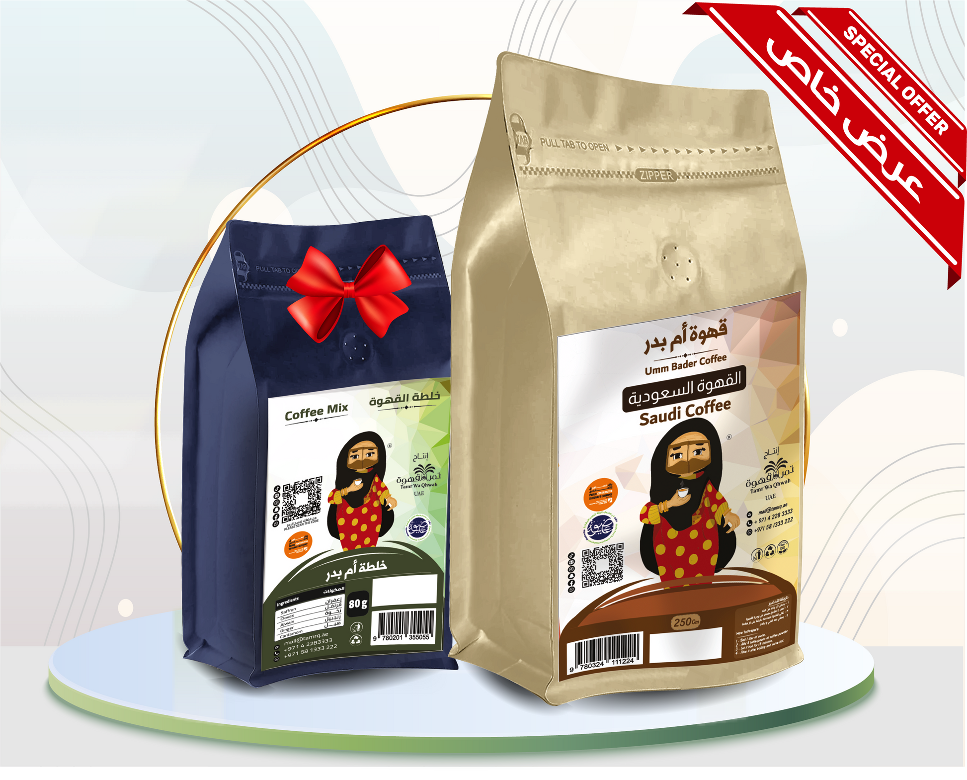 تقدم أم بدر مزيج قهوة سعودي تقليدي معزز بمزيج قهوة متوازن جيدًا، مصمم لتقديم رائحة غنية ومذاق سلس وكامل القوام في كل كوب.